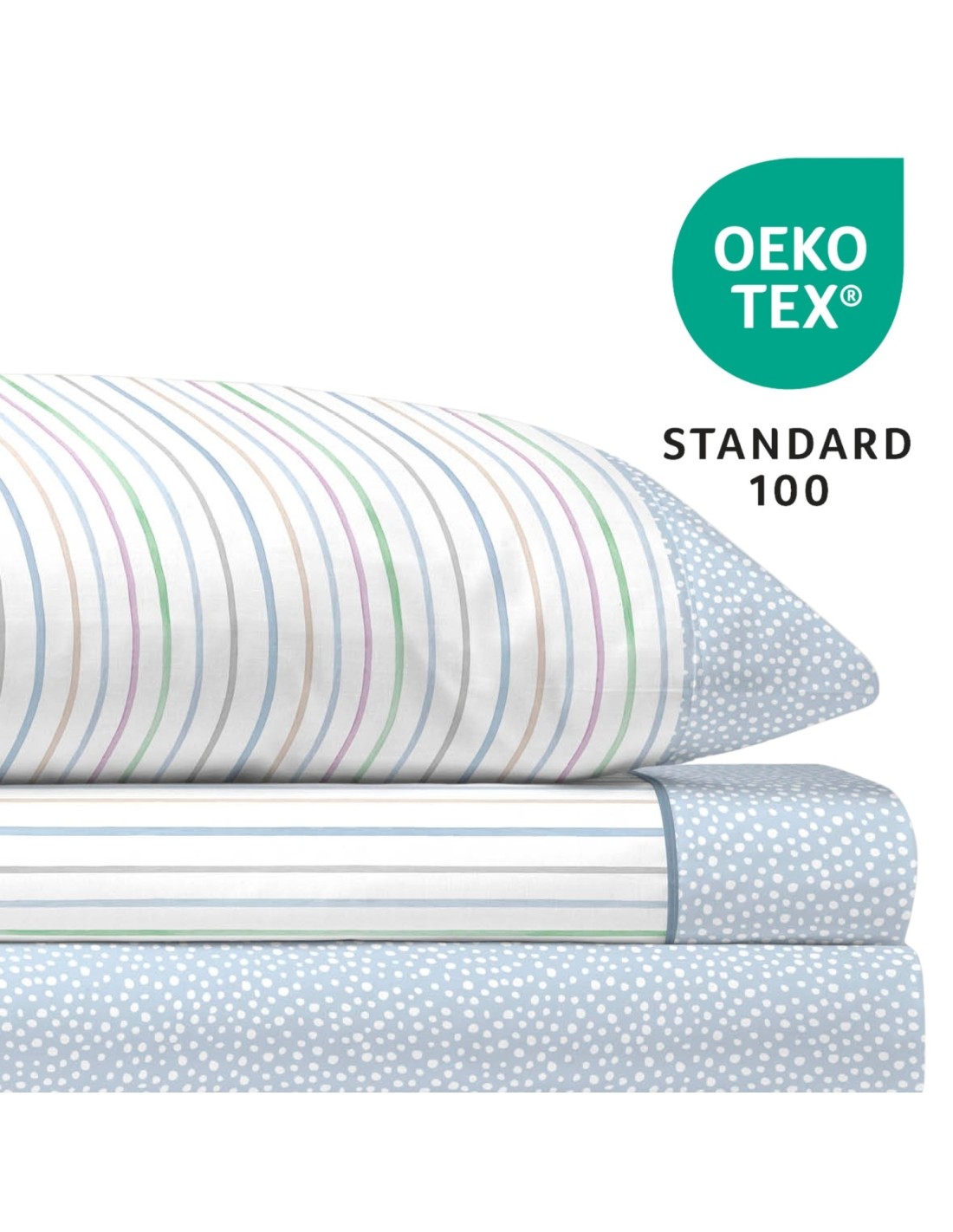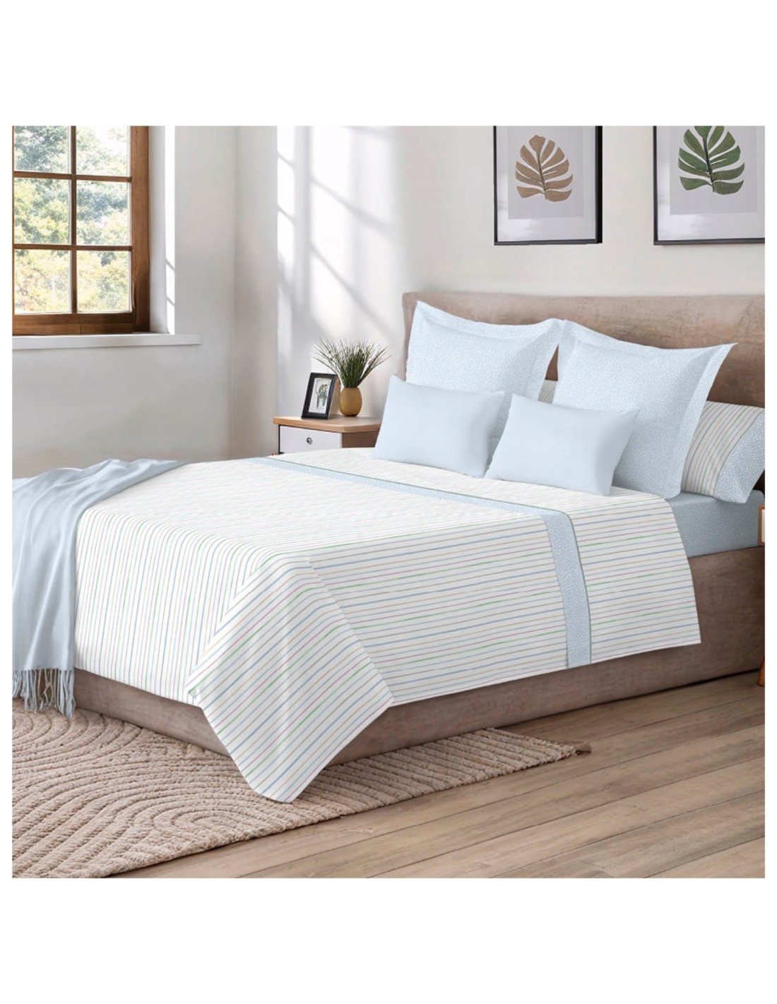 Juego de sábanas de 3 piezas confeccionado en 144 hilos 48% algodón y 52% poliéster. Diseño moderno de rayas finas disponible en Menta, Gris y Azul. Suaves, resistentes y de fácil planchado.