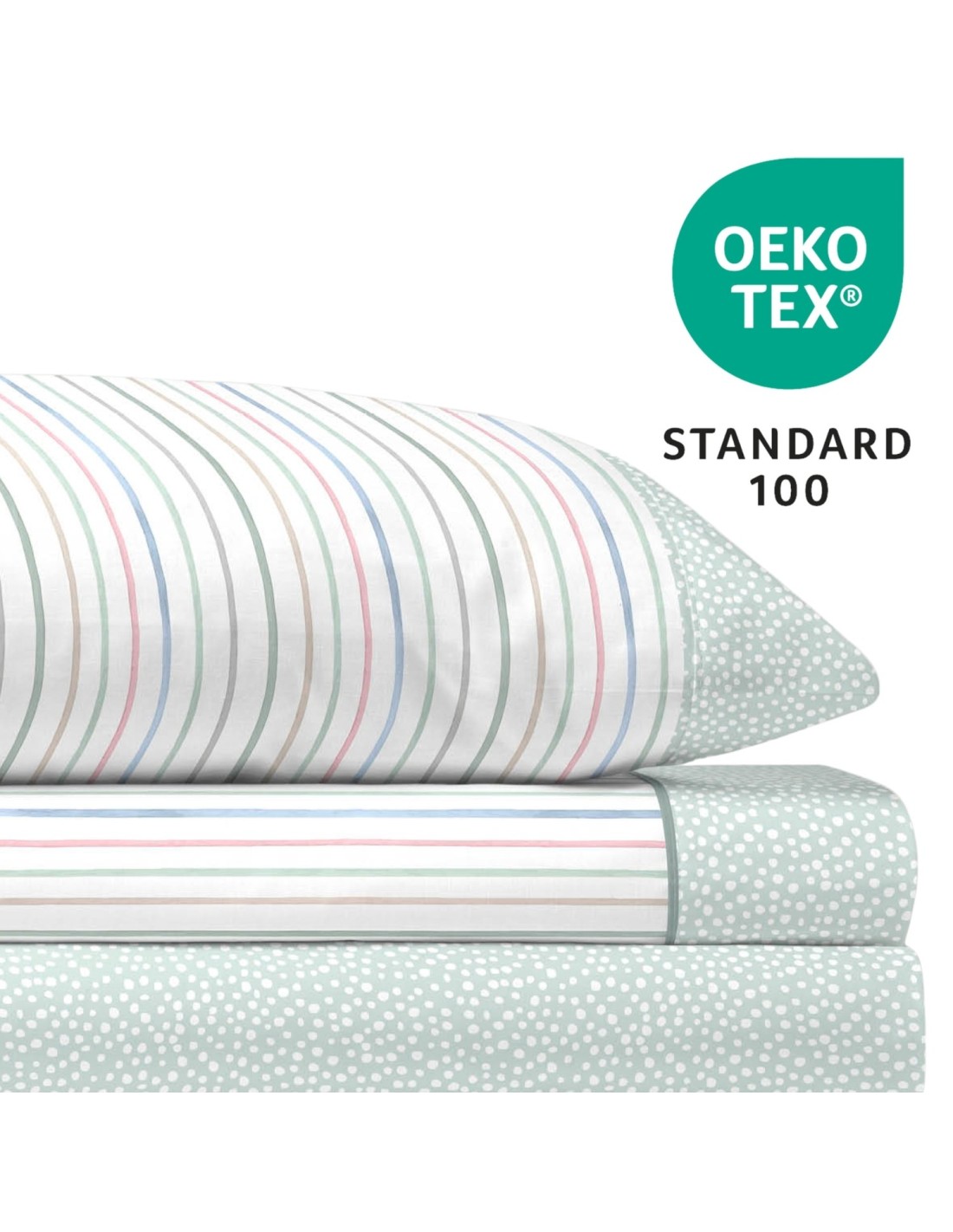 Juego de sábanas de 3 piezas confeccionado en 144 hilos 48% algodón y 52% poliéster. Diseño moderno de rayas finas disponible en Menta, Gris y Azul. Suaves, resistentes y de fácil planchado.